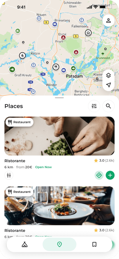 AnnaCampPilot zeigt dir Campingplätze und was es in der Umgebung gibt. Einen Strand, eine Spazierroute und ein gutes Restaurant haben wir in wenigen Minuten gefunden — ganz ohne zwischen mehreren Apps hin und her zu wechseln.